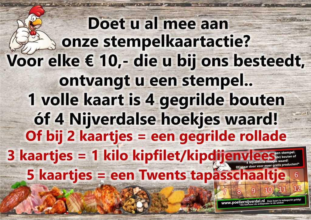 Wij hebben in onze winkel een stempelkaartactie. Bij besteding van elke € 10,-* ontvangt u een stempel, bij 12 stempels kunt u de kaart inleveren voor 4 verse/gegrilde bouten of 4 Nijverdalse hoekjes. In de winkel komt op het scherm langs waar u met meerdere kaartjes voor kunt sparen (of zie de afbeelding hieronder)!