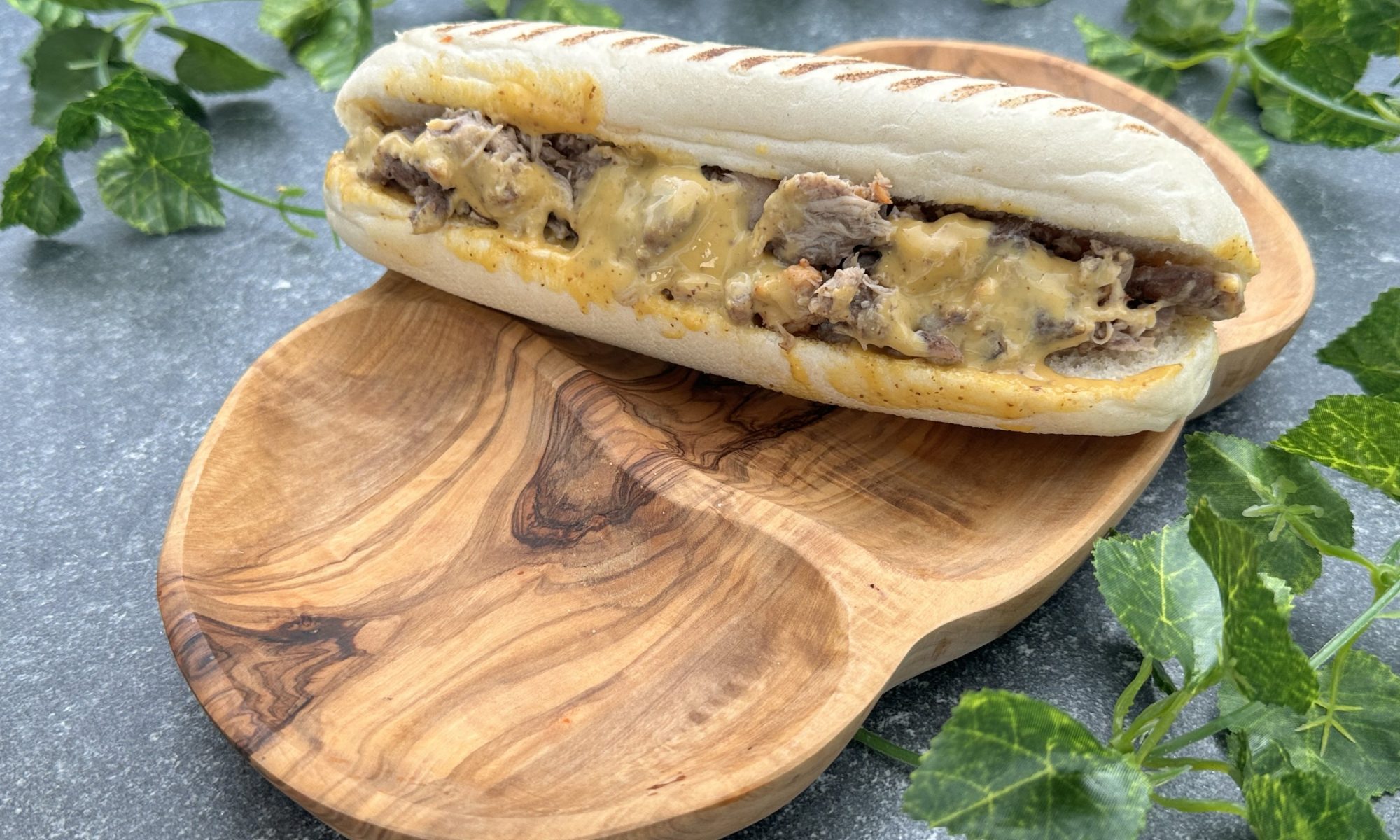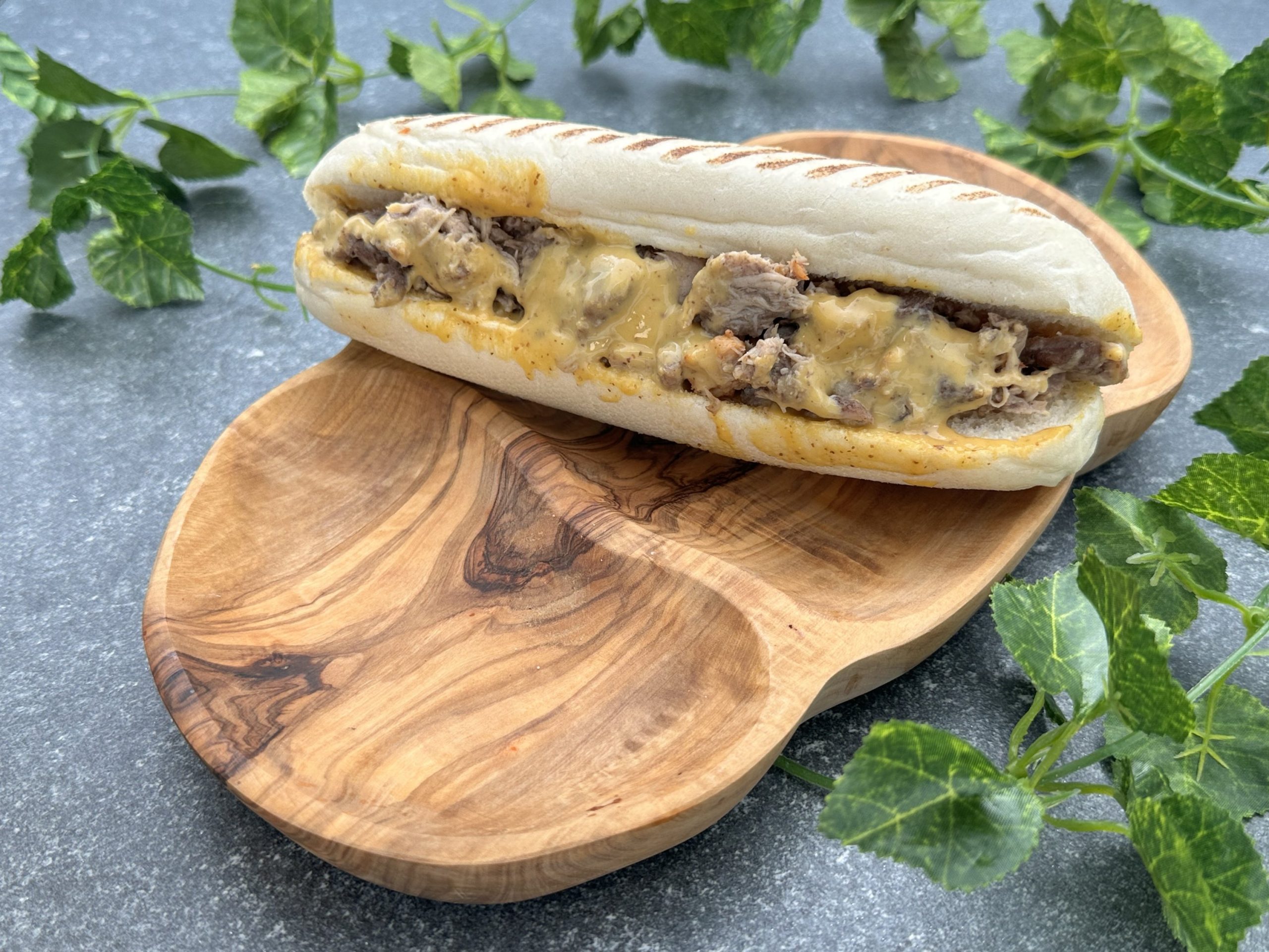 Panini met kipdij gekruid met kruidnagel in een honing mosterdsaus..
