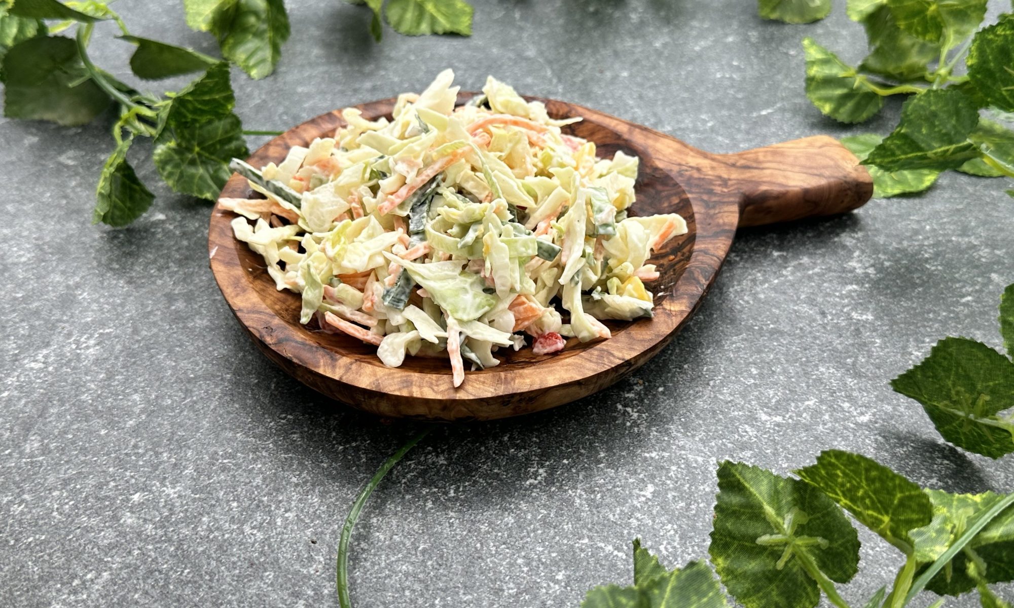 Gemengde rauwkost van spitskool, prei, gele paprika, rode paprika, groene paprika, wortel en roomkoolsalade