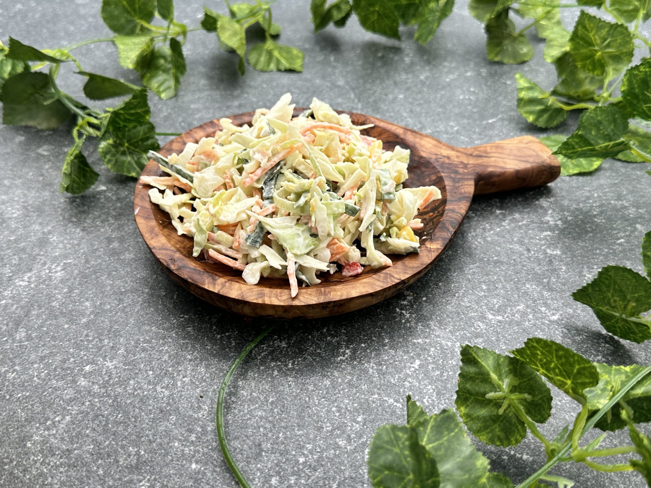 Gemengde rauwkost van spitskool, prei, gele paprika, rode paprika, groene paprika, wortel en roomkoolsalade